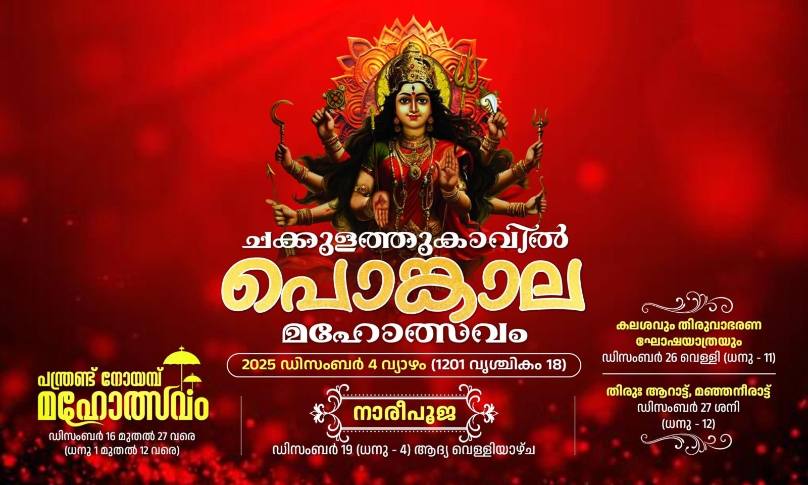 ആലപ്പുഴ : പ്രസിദ്ധമായ ചക്കുളത്തുകാവിലെ പൊങ്കാല ഡിസംബർ നാലിന് നടക്കുമെന്ന് ക്ഷേത്ര മാനേജിങ് ട്രസ്റ്റിയും ചീഫ് അഡ്‌മിനിസ്ട്രേറ്ററുമായ മണിക്കുട്ടൻ നമ്പൂതിരി പത്രസമ്മേളനത്തിൽ പറഞ്ഞു. കേന്ദ്രമന്ത്രി ജോർജ് കൂര്യൻ ഉദ്ഘാടനംചെയ്യും. തമിഴ്‌നാട് മുൻ മുഖ്യമന്ത്രി ഒ. പനീർശെൽവം മുഖ്യാതിഥിയാകും.