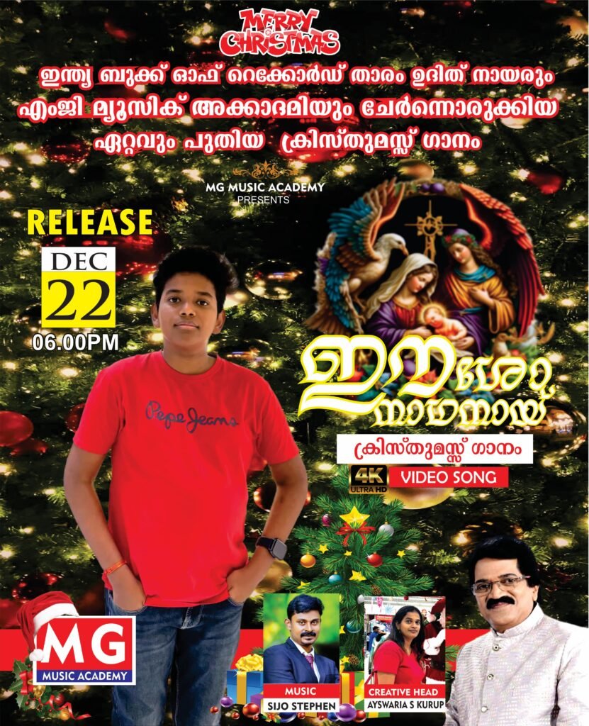 തിരുവനന്തപുരം : റുബിക്സ് ക്യൂബയിൽ ഇന്ത്യ ബുക്ക് ഓഫ് റെക്കോർഡ് ഹോൾഡറും സംഗീത കുലപതിയും ജനപ്രിയ ഗായകനുമായ എം ജി ശ്രീകുമാറിന്റെ സംഗീത വിദ്യാലയവുമായ എം ജി മ്യൂസിക് അക്കാദമിയിലെ സംഗീത വിദ്യാർത്ഥിയുമായ ഉദിത് നായർ പാടി അഭിനയിച്ചിരിക്കുന്ന “ഈശോ..നാഥൻ” ക്രിസ്തുമസ് സംഗീത ആൽബം ഇന്ന് റിലീസ് ചെയ്യും. എം ജി എംസിസി അക്കാഡമിയുടെ ഒഫീഷ്യൽ യൂട്യൂബ് ഫേസ്ബുക് ചാനലുകളിലാണ് റിലീസ്.